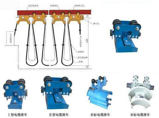 ZYGHC型工字鋼電纜滑車系列為起重機小車供電的一種導電形式。它有走輪、支架、托板組成,將軟電纜固定在托板上,由牽引架與電纜滑車同步,從而實現小車供電的目的。